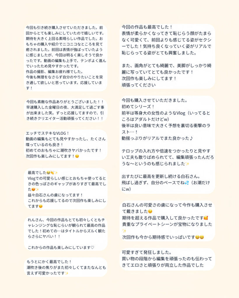 前回のVlog風の作品、「ナンダコレ?」どころか大成功の挑戦でしたよ!白石ちゃんのパーソナルな魅力から自然にエロい展開に繋がっていく構成が本当に素晴らしくて、寝る間を惜しんでこだわってくれた編集の努力が映像からビシビシ伝わってきました。本当にお疲れ様でした!